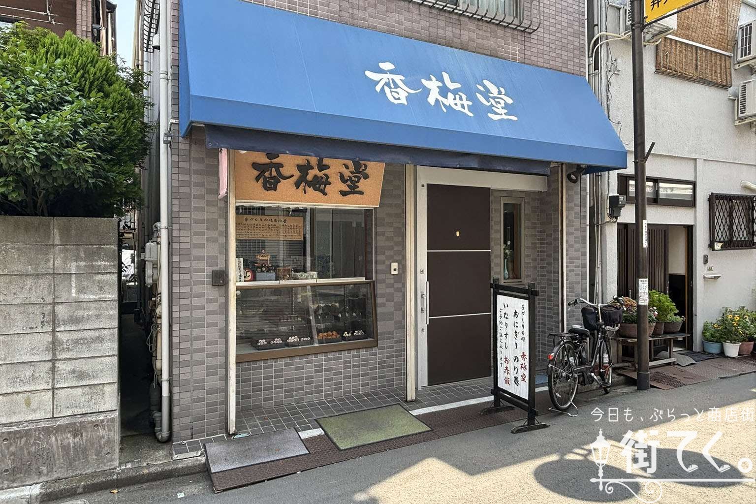 「香梅堂」の看板を掲げた店の前に数人の客が見える。