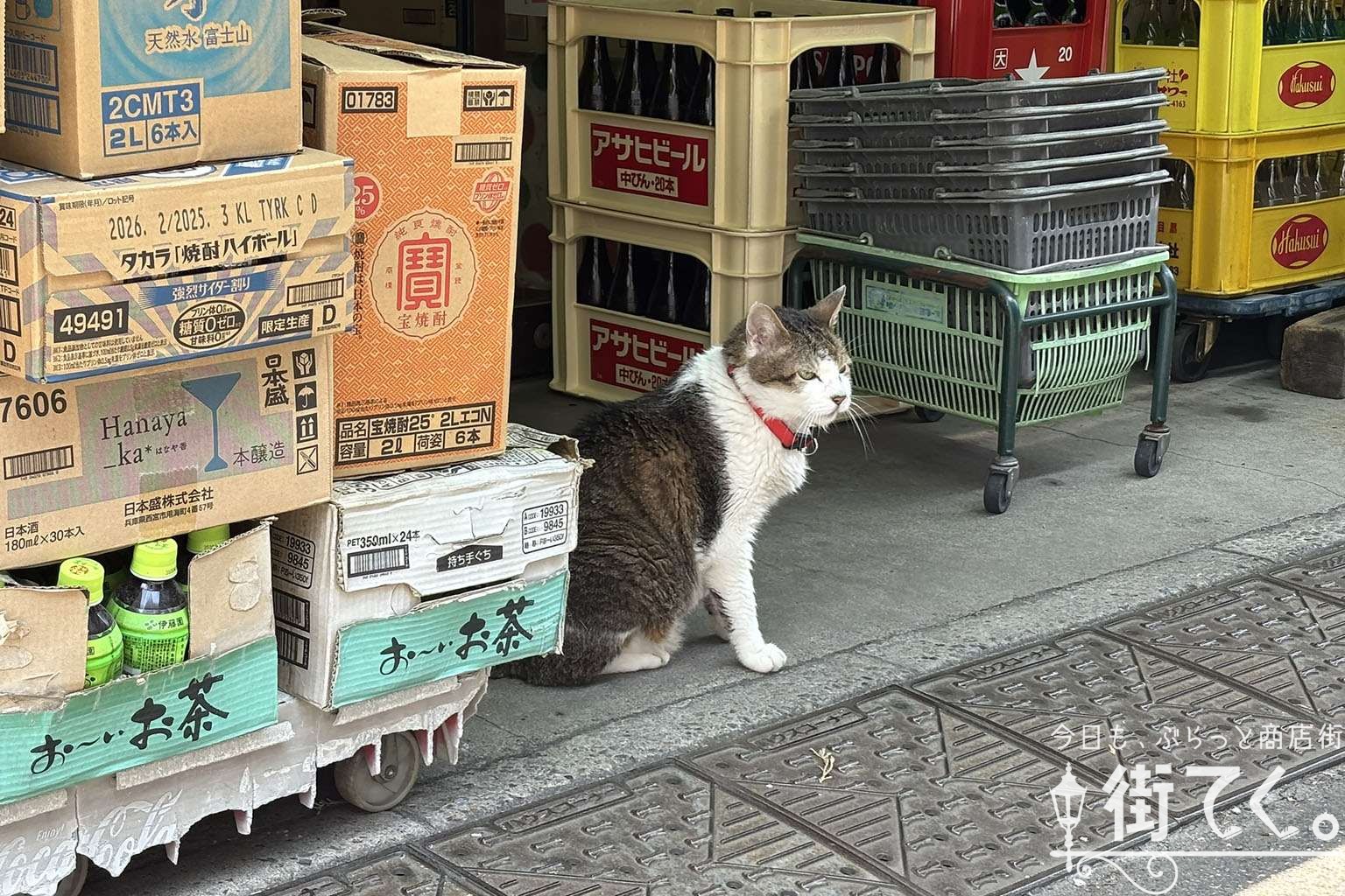 さらに先に行くと店先で猫が店番をする酒店があった。