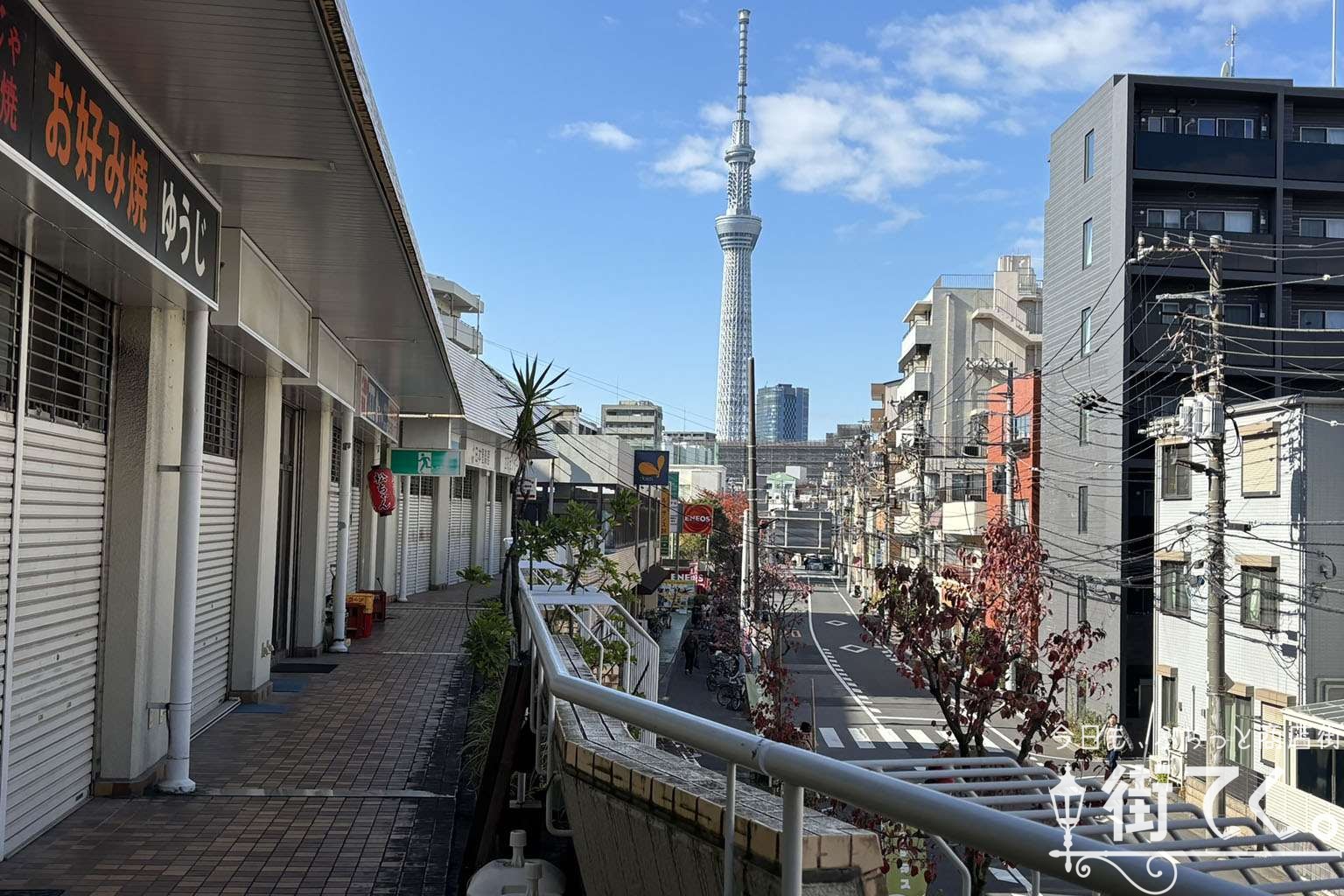 マンションを横目に緩いカーブを曲がるとスカイツリーの姿。