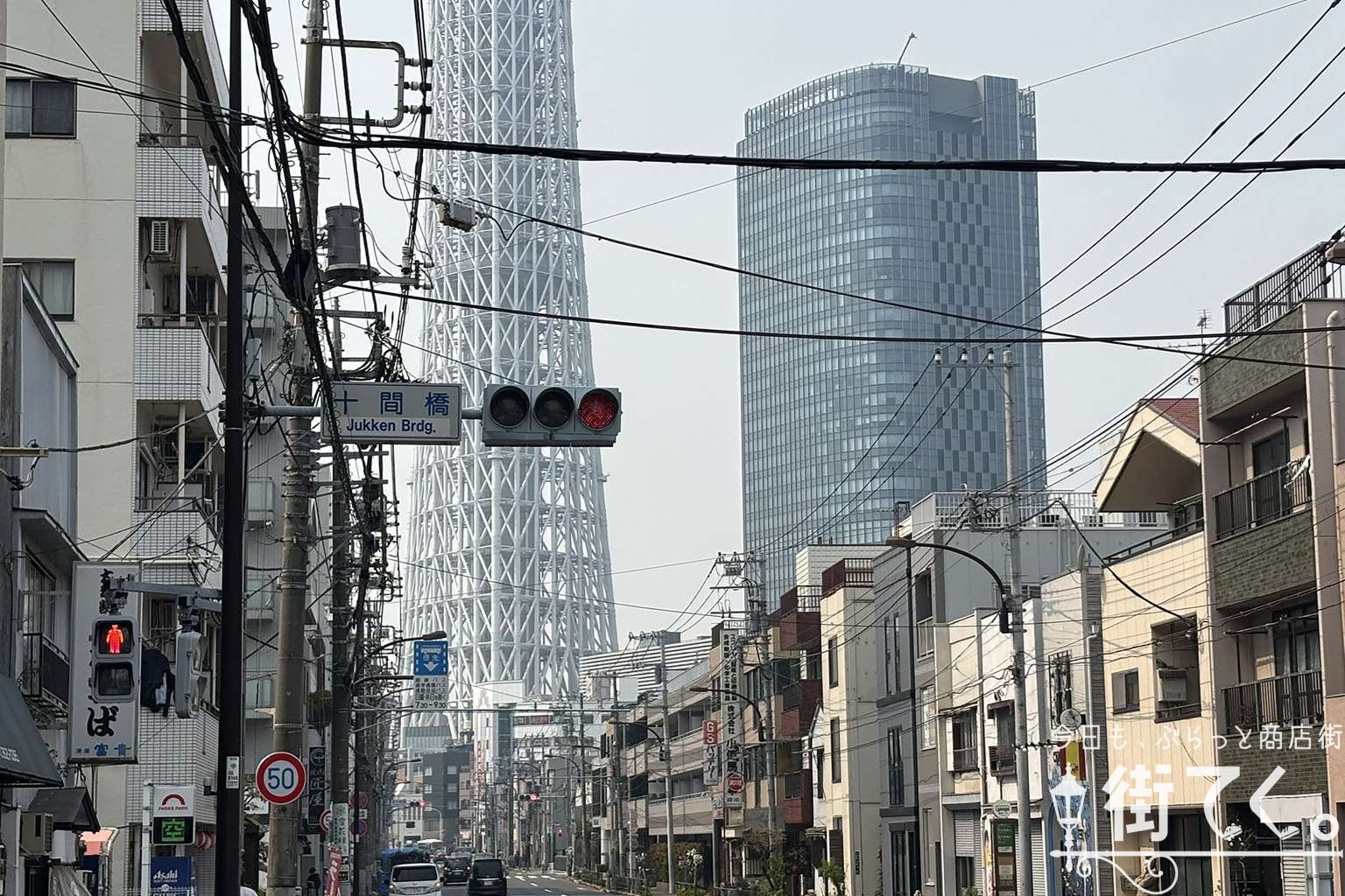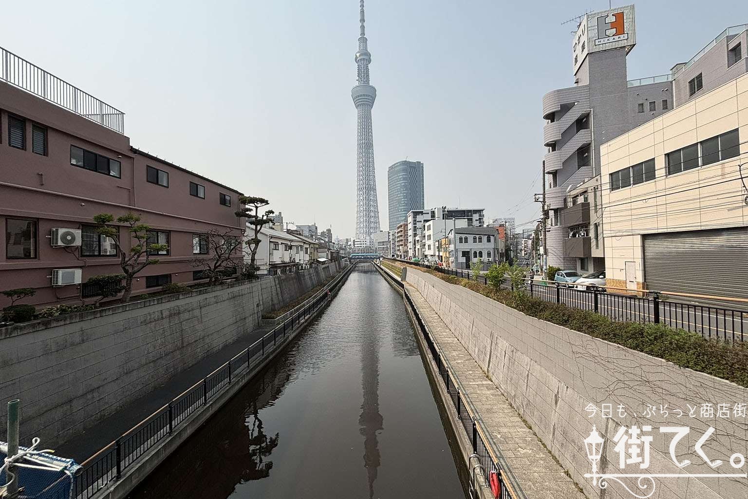 駅を出てスカイツリーを背に北十間川沿いを歩いて行くと