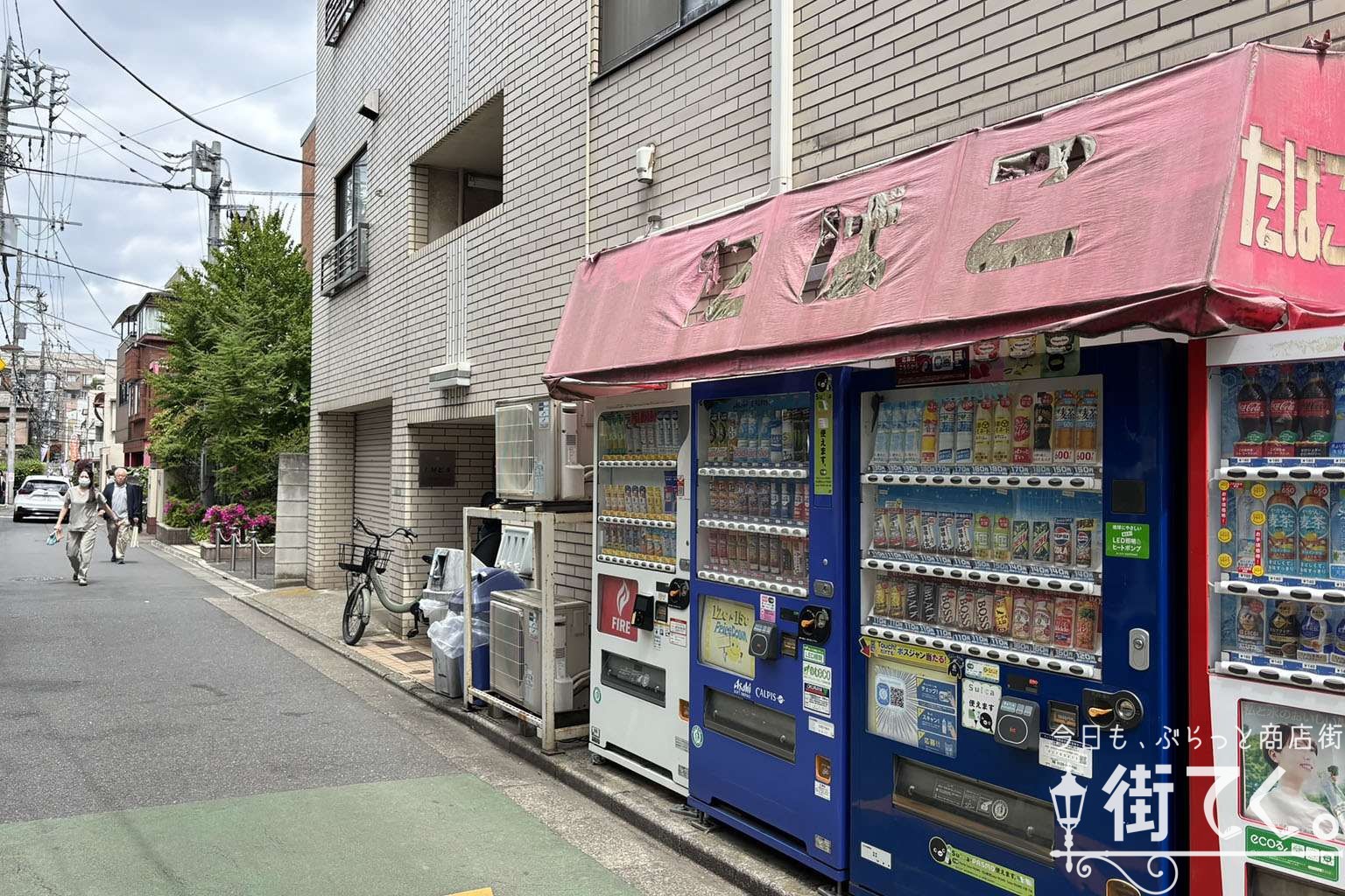 破れかけた「たばこ」の文字の赤いサンシェードと数台の自動販売機。