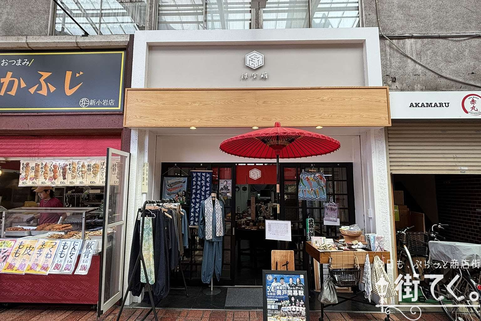 真赤な野立傘が目を惹く店舗は呉服店の「はな萌」。