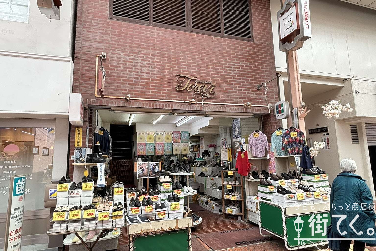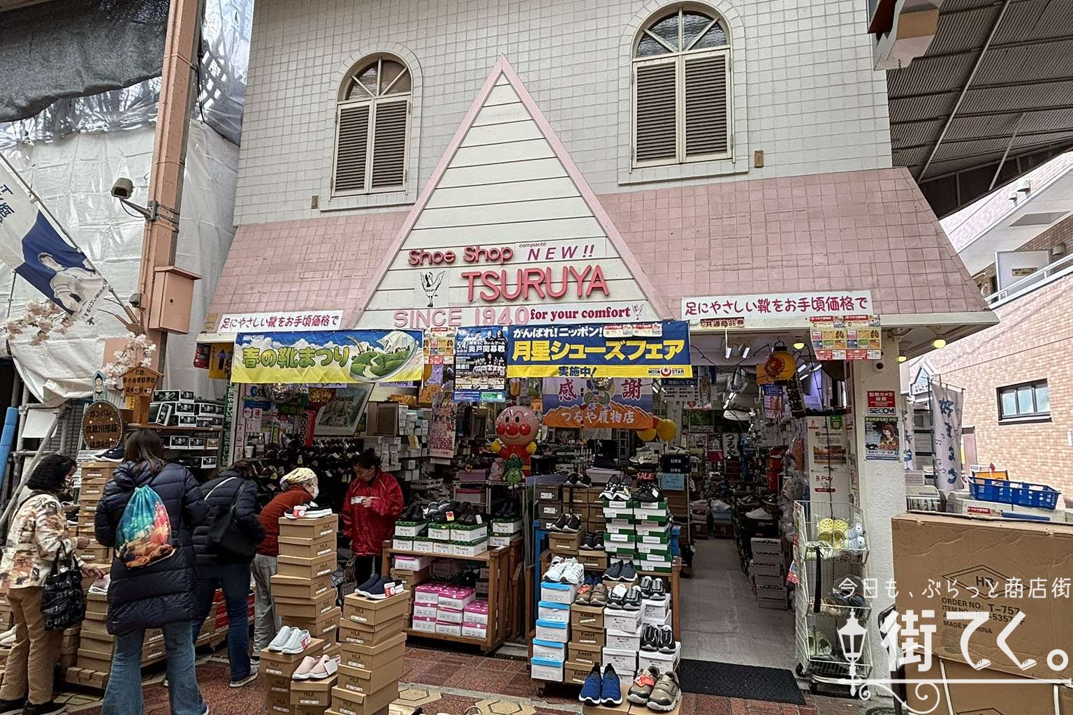 店主が店先で大きな段ボール箱から靴を出しているのは「つるや履物店」。
